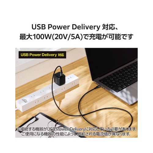 スマートフォンもパソコンも、これ1本で高速充電!USB2.0、USB Power Delivery(最大100W)対応のUSB Type−C(TM)ケーブル。 |
