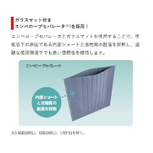 鋳造式グリッドと高密度化ペーストを採用厳しい環境下でも安心してお使いいただけるハイブリッド極板構成を採用。連続走行や工事現場での激しい振動下でも、十分な性能を発揮します。