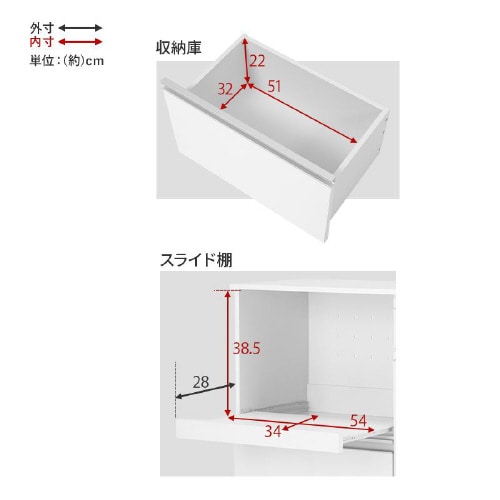 主材:プリント紙化粧パーティクルボード、天板・スライド棚:合成樹脂化粧パーティクルボード、取手:スチール