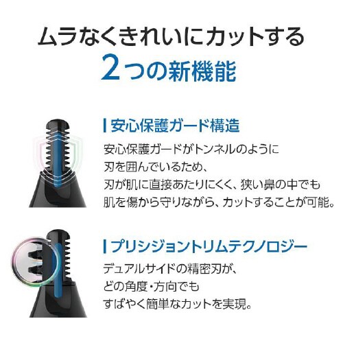 安心保護ガード構造のフィリップスノーズエチケットカッター 1000シリーズなら、肌を守りながら毛をカットすることができます。 |