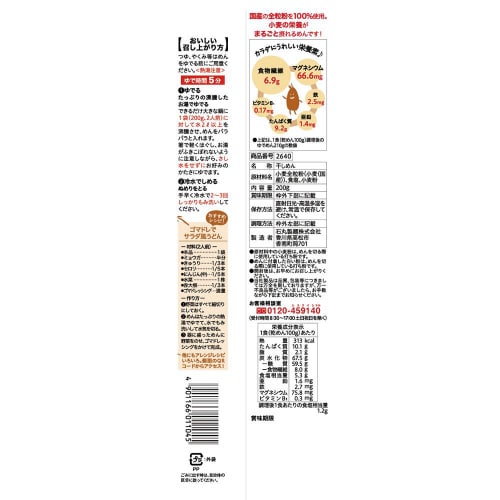 全粒粉100%、国産小麦100%使用。小麦粉の表皮から中心部分までまるごと使用し、小麦の栄養素がまるごと摂れる乾麺です。不足しがちな食物繊維を茹で上げ後の状態で約6.9gと1日に必要な摂取量の3分の1 |