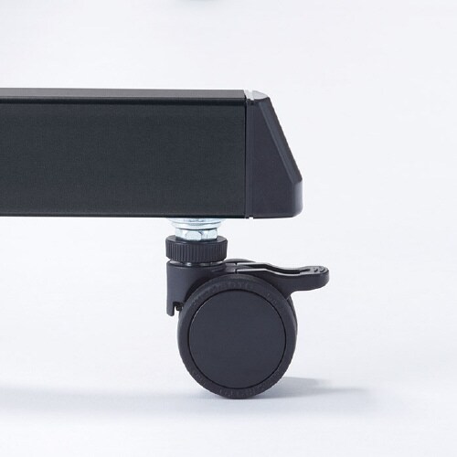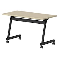 レバー操作で天板がフラップするスタックテーブル。連ねての収納が可能。スチール製の棚付きで便利。脚部はL型で足抜けが良く、キャスターはストッパー付きなので楽に移動、固定できます。 |