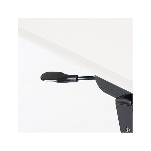 レバー操作で天板がフラップするスタックテーブル。連ねての収納が可能。スチール製の棚付きで便利。脚部はL型で足抜けが良く、キャスターはストッパー付きなので楽に移動、固定できます。 |