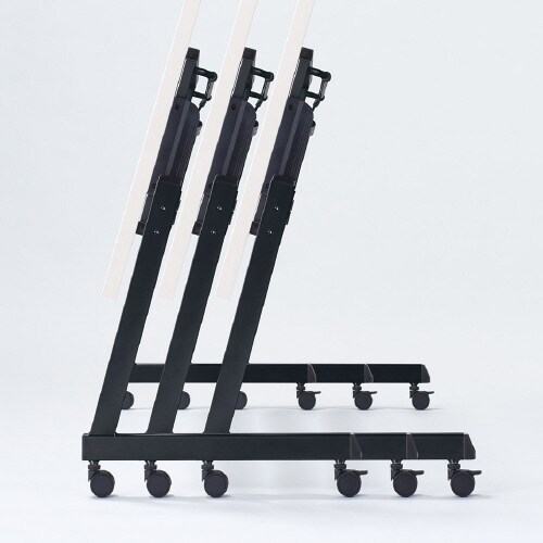 レバー操作で天板がフラップするスタックテーブル。連ねての収納が可能。スチール製の棚付きで便利。脚部はL型で足抜けが良く、キャスターはストッパー付きなので楽に移動、固定できます。 |