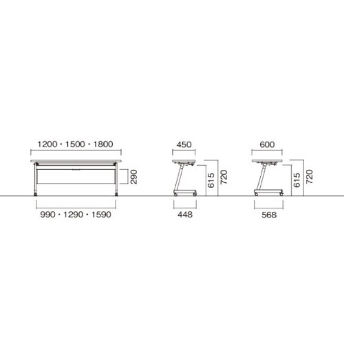 レバー操作で天板がフラップするスタックテーブル。連ねての収納が可能。スチール製の棚付きで便利。脚部はL型で足抜けが良く、キャスターはストッパー付きなので楽に移動、固定できます。 |