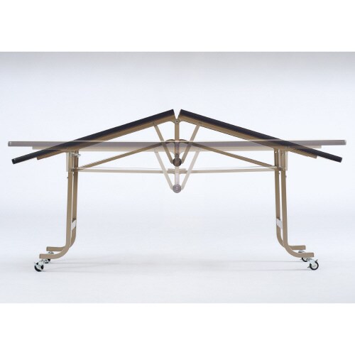 天板を折り畳むタイプの折り畳みテーブル。天板の開閉機構はセーフティロック機能付きで、手を挟まないように設計。開閉操作用のツマミで折り畳み操作。脚部にはキャスターがついており、移動も楽に行えます。 |