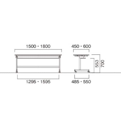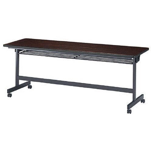 レバー操作で天板フラップするスタックテーブル。テーブルを連ねて収納。スチール製の棚付き。脚部はT字で足抜けが良く、ストッパー付きキャスターで楽に移動、固定。アジャスト機能で高さの微調整も可能。 |