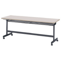 レバー操作で天板フラップするスタックテーブル。テーブルを連ねて収納。スチール製の棚付き。脚部はT字で足抜けが良く、ストッパー付きキャスターで楽に移動、固定。アジャスト機能で高さの微調整も可能。 |