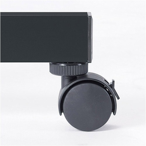レバー操作で天板フラップするスタックテーブル。テーブルを連ねて収納。スチール製の棚付き。脚部はT字で足抜けが良く、ストッパー付きキャスターで楽に移動、固定。アジャスト機能で高さの微調整も可能。 |