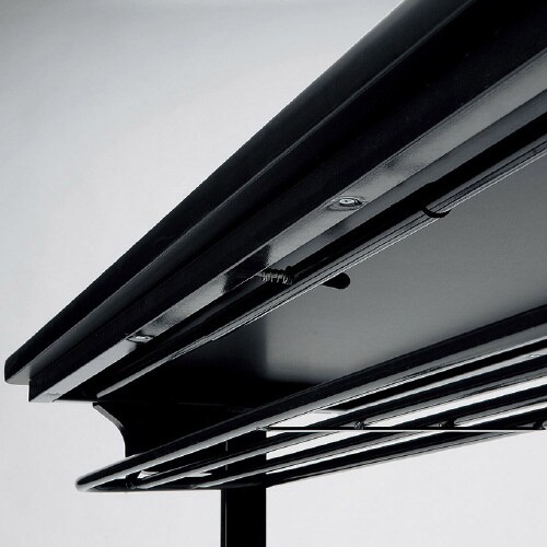 レバー操作で天板フラップするスタックテーブル。テーブルを連ねて収納。スチール製の棚付き。脚部はT字で足抜けが良く、ストッパー付きキャスターで楽に移動、固定。アジャスト機能で高さの微調整も可能。 |