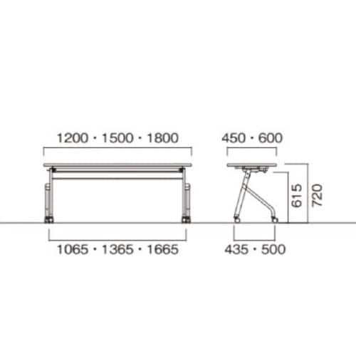 レバー操作で天板がフラップするスタックテーブル。平行スタックで一列に収納。スチール製の棚付き。ストッパー付きキャスターで楽に移動、固定。アジャスト機能も付いて高さの微調整も可能。 |