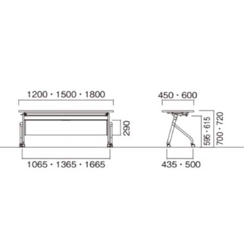 レバー操作で天板がフラップするスタックテーブル。平行スタックで一列に収納。スチール製の棚付き。ストッパー付きキャスターで楽に移動、固定。アジャスト機能も付いて高さの微調整も可能。 |