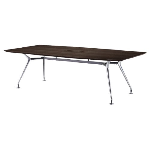 舟底テーパーエッジ天板でシャープな印象のビッグテーブル。脚部は光沢が美しいアルミダイキャスト磨き仕様。脚にはレベル調整用のアジャスター付き。指紋などの汚れが目立ちにくい抗菌仕様のメラミン化粧板です。 |