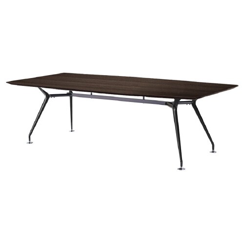 舟底テーパーエッジ天板でシャープな印象のビッグテーブル。脚部はアルミダイキャストブラック焼付塗装で高級感のある仕様。レベル調整用のアジャスター付き。指紋などの汚れが目立ちにくい抗菌メラミン化粧板。 |