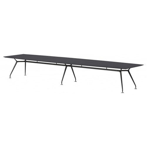 舟底テーパーエッジ天板でシャープな印象のビッグテーブル。脚部はアルミダイキャストブラック焼付塗装で高級感のある仕様。レベル調整用のアジャスター付き。指紋などの汚れが目立ちにくい抗菌メラミン化粧板。 |