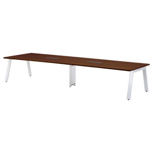ハの字脚で安定感抜群のビッグテーブル。中間脚はワイヤリングカバー付で床からの立上げ配線を収納。脚間が広い設計。脚にはレベル調整用のアジャスター付き。指紋などの汚れが目立ちにくい抗菌メラミン化粧板。 |