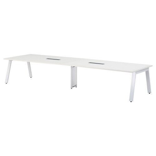 ハの字脚で安定感抜群のビッグテーブル。中間脚はワイヤリングカバー付で床からの立上げ配線を収納。脚間が広い設計。脚にはレベル調整用のアジャスター付き。指紋などの汚れが目立ちにくい抗菌メラミン化粧板。 |