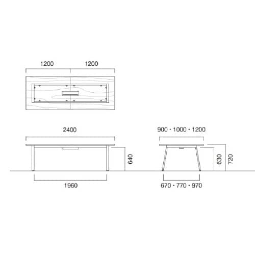 解放感と安定感のある八の字脚デザインのビッグテーブル。天板は耐水・耐熱性に優れた高圧メラミンで傷が付きにくい。脚端にはレベル調整用のアジャスター付き。指紋などの汚れが目立ちにくい抗菌メラミン化粧板。 |