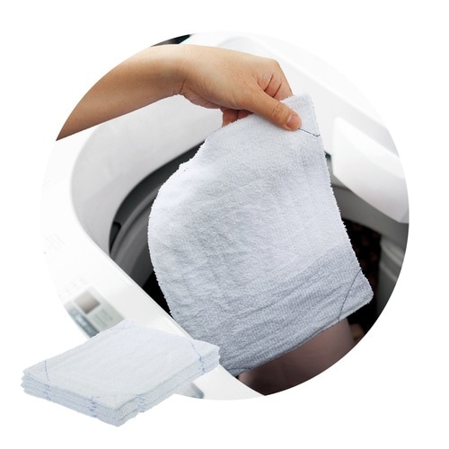 洗濯機で洗ってもほつれにくいように、縫い目を増やした布製の雑巾です。手の小さい方にも使いやすい小判サイズです。四隅の縫い糸が違う色なので通常の雑巾と見分けやすくなっています。10枚入り。白。 |