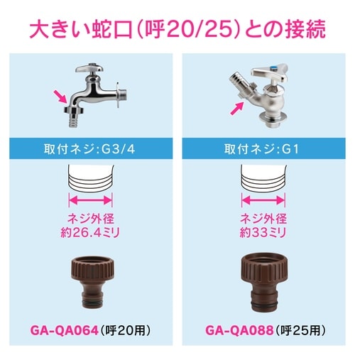 大きい蛇口(呼20・呼25)に太ホースをつなぐためのジョイントです。 |