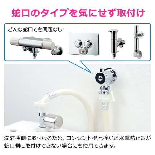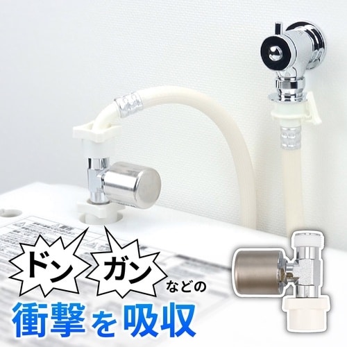 洗濯機とホースの間に接続することで、水撃を防止しうるさい衝撃音を緩和する装置です。 |