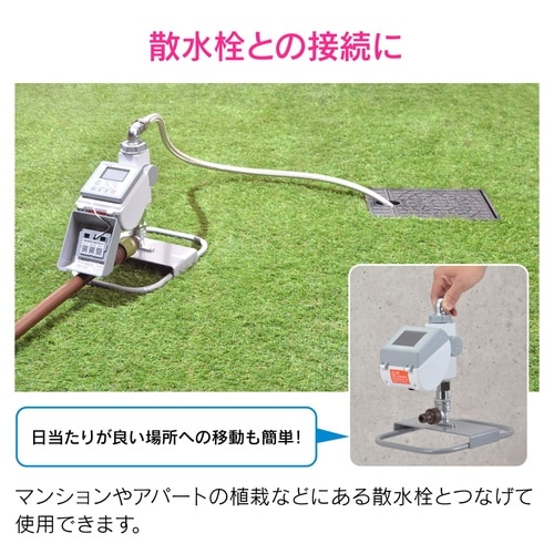 蛇口に取付け、時間などを設定しておくと自動で水やりを行うソーラー発電式タイマーです。 |