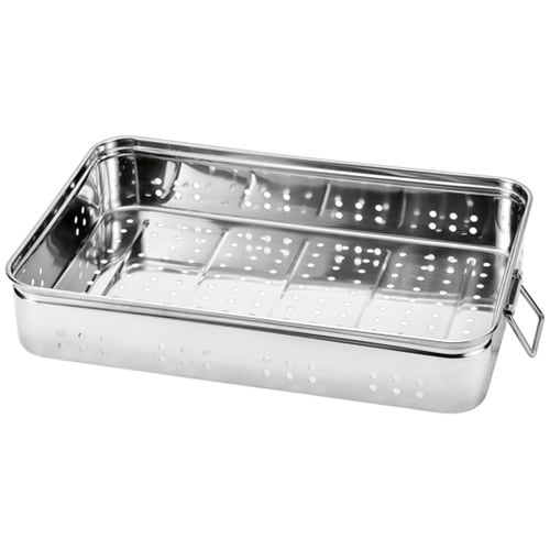 大人数分の食材の仕込みや運搬に、幅広く使われている大型バット。 |