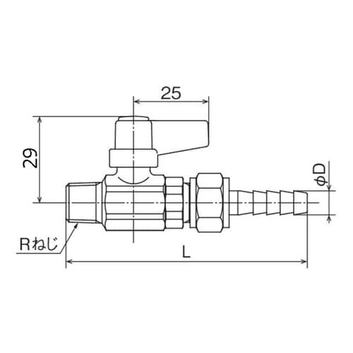 呼び径:R3/8×Φ10.5ホースニップル | 材質(本体):黄銅 | 使用温度範囲[℃]:−20ー80 | 最高許容圧力[MPa]:1 | 使用流体…