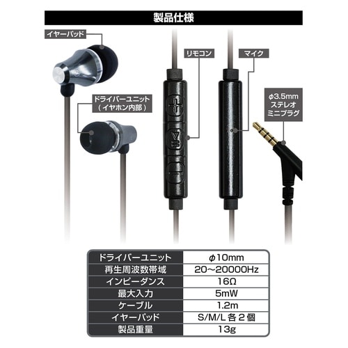 強靭タイプのカナル式イヤホン。 |