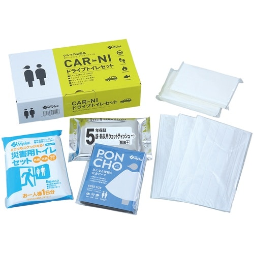 ウェットティッシュ、トイレセット、ポンチョ、マスク、ティッシュの5品をセットにしました。 |