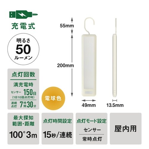 本体サイズ(約):W49×D13.5×H200mm | 重量(約):105g | カラー:アイボリーホワイト | 電球:0.5W 高輝度電球色LED …