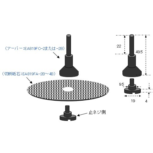 用途:EA819FA−2B―EA819FA−4B用アーバー | 適合砥石穴径:3/8”(9.5mm) | 軸径:6.0mm | 単位:1本