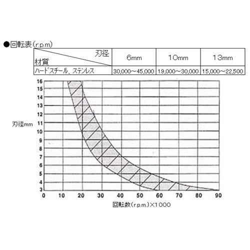 【使用上の注意】、1.超硬バーが最高の能力を発揮する為には、切削物に対して最適な回転数に  調整する事が必要です。、2.硬い材質のものほど、低い回転数で使用してください。、3.サイズの小さい超硬バーほど高い回転数