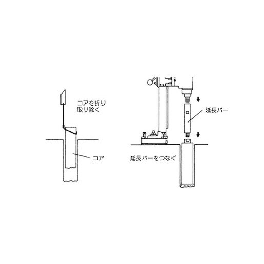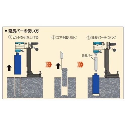 ビットの有効長以上に深堀が必要な場合、ダイモドリルとビットの間につぎ足して深堀穿孔作業を行うことができます。、※延長バーを使用の際は必ずコアを取り出してから作業してください