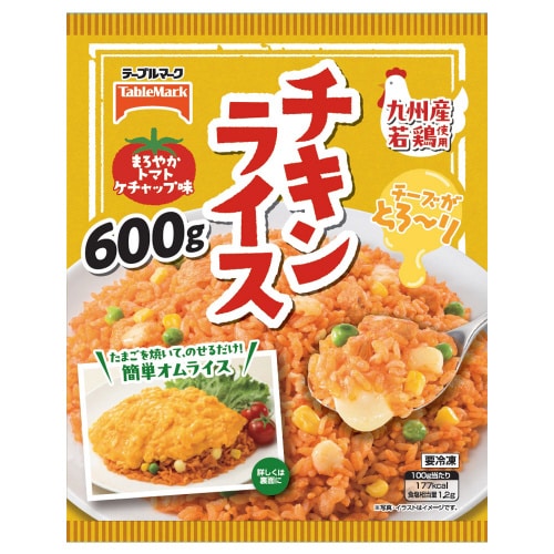 まろやかなケチャップ味のチキンライス。鶏肉は国産原料にこだわり、九州産若鶏を使用。とろりチーズで、お子様にも召し上がっていただきやすい味付けです。 |
