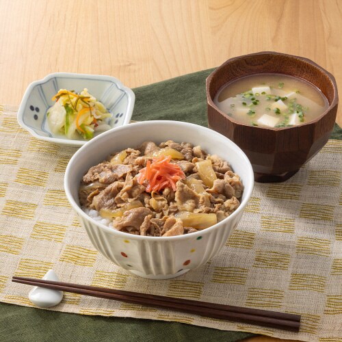 吉野家の牛丼の美味しさそのままに。温めてごはんにかけるだけで「あの味」。100gあたりの食塩相当量は約1.0g。(業務用約10食分) |