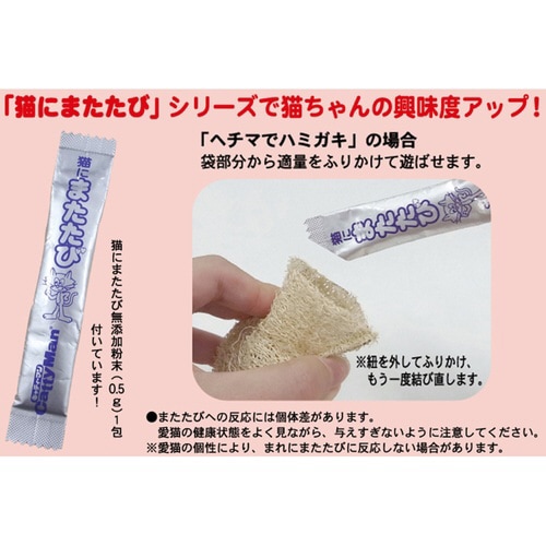 ヘチマを使用した猫用ハミガキ玩具。またたび粉つき。 |