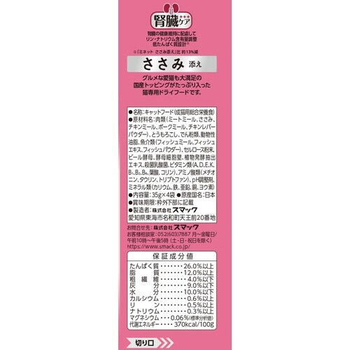 腎臓の健康に配慮し、リン・ナトリウムの含有量を調整、低たんぱく質設計。Mg値0.06%。 |