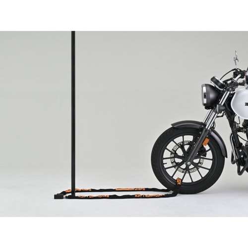 焼き入れ加工のスチール合金製Φ8チェーンは軽量で高耐久。ノコギリやハンマーに強く、盗難対策に有効。キーロック部はアルミ仕上げで、防塵・防水のキーシャッター付き。