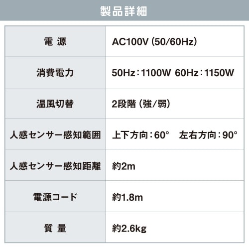 【速暖】【人感センサー】【1200W】狭いスペースには縦置き、温風を広範囲に広げたいときは横置きと、2通りの置き方ができます。電源が入ると、すぐに温まります。 |