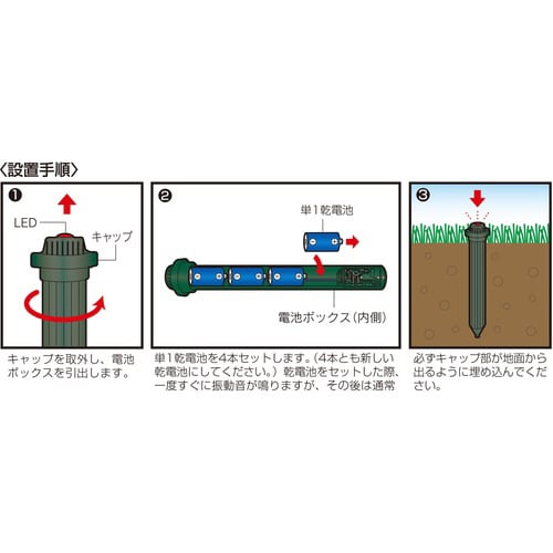土中に差し込むだけで音波振動を発しモグラを驚かせます。 |