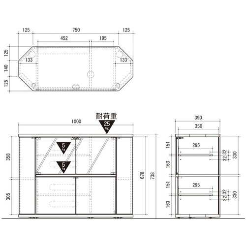 [ガラス扉内]可動棚×2枚(約幅45.2×奥行29.5×高さ1.5cm)[木扉内]固定棚×1枚(約幅13.3×奥行35×高さ1.5cm)