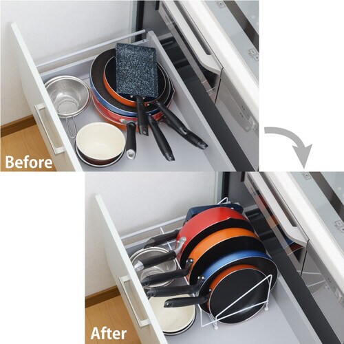 散らかりがちなシンクやコンロ下のフライパンをスッキリ収納。 |
