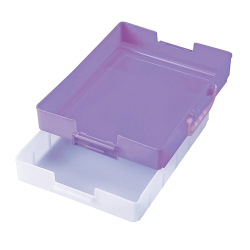 中が見やすい!透明フタおどうぐばこ。フタと本体の色が違うので入れる物の仕分けができる。スタッキング可能。フタにA4サイズ、本体にB5サイズが入る。名前シール付。 |