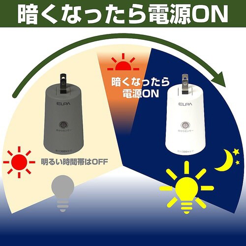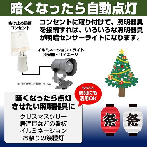 周囲が暗くなると自動で電源が入り、明るくなれば自動で電源が切れますので、イルミネーションや庭園灯・防犯灯・外灯につなぐことで、簡単に夜間連続点灯器具として使用できます。耐トラッキングカバー付プラグを採 |