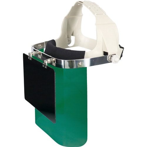 JIS規格相当のW用遮光プレート(No.7/10)付き防災面です。ヘルメット不要の直かぶりタイプで、片手でサイズ調整できるギアバンド式。正面が平らな角型レンズを採用しています。