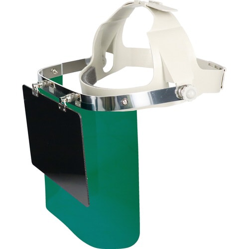 JIS規格相当のW用遮光プレート(No.7/10)付き防災面です。ヘルメット不要の直かぶりタイプで、後頭部の凹凸でサイズ調整し、ずれにくいプラバンド式。正面が平らな角型レンズを採用しています。 |