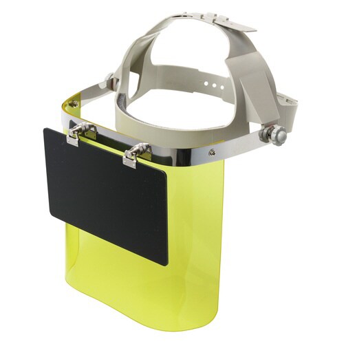 ヘルメット不要の直かぶり防災面です。後頭部の凹凸でサイズ調整し、ずれにくいプラバンド式を採用。前プレートは標準、スモークグリーン、600薄の3種から選択可能で、正面は平らな角型レンズです。