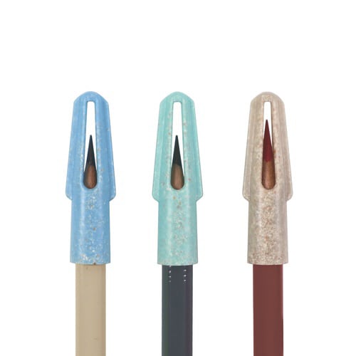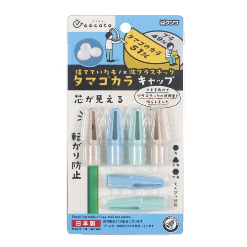 芯が見えて転がらない。捨てていたモノ(卵殻や紙粉)を再利用。窓付き形状でプラスチック使用量を削減。転がり防止形状。三角軸、六角軸、丸軸鉛筆に対応。 |