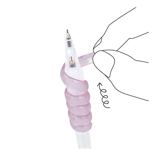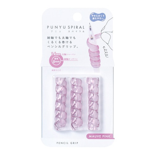 細軸でも太軸でもくるくる巻けるペンシルグリップ。細軸(約8mm)から太軸(約14mm)の筆記具に取付可能。疲れにくくスパイラル形状が指にフィット。巻いて付けるので付け外しが簡単。
